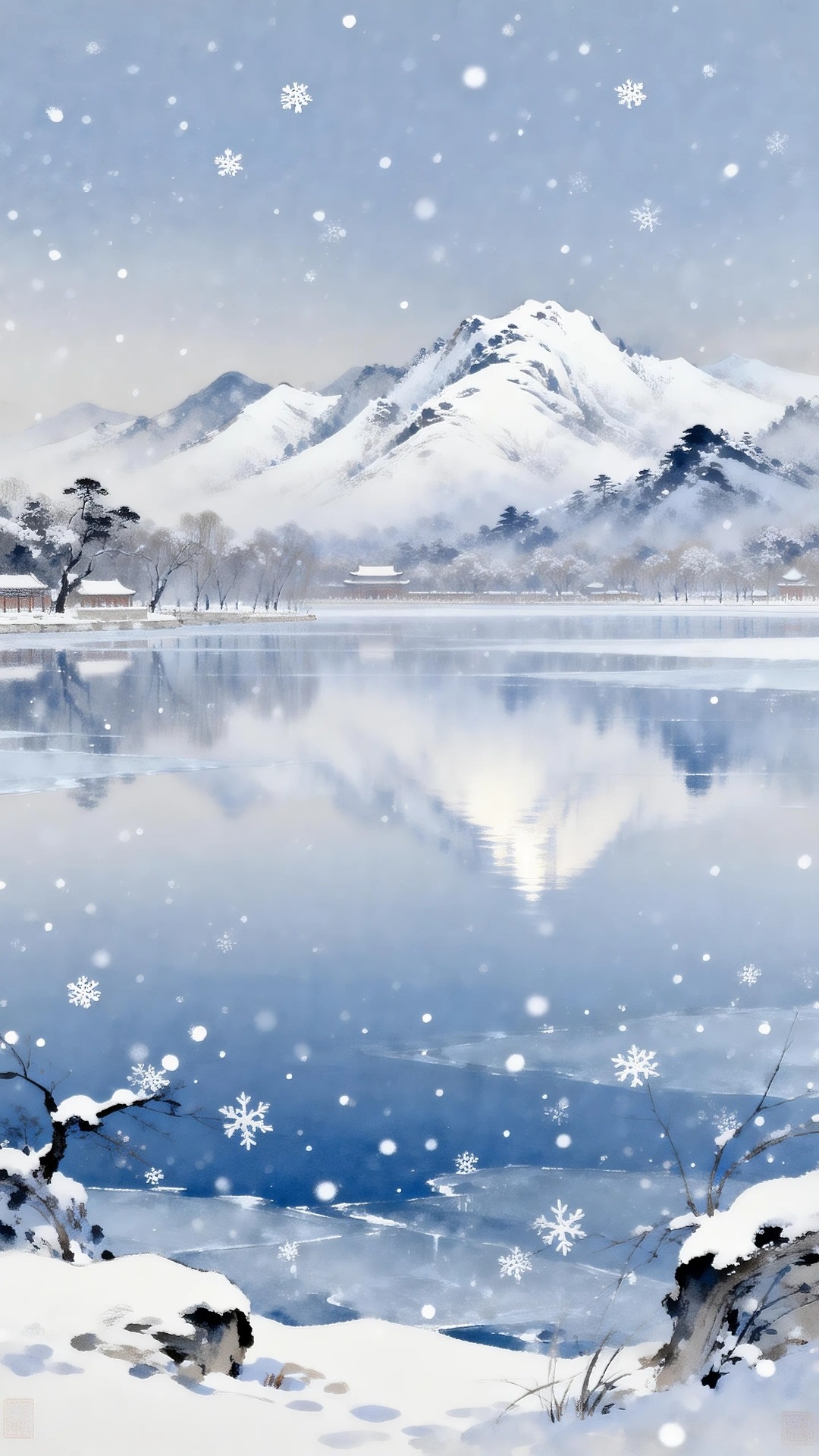 池头六出花飞遍,池水无波冻欲平。